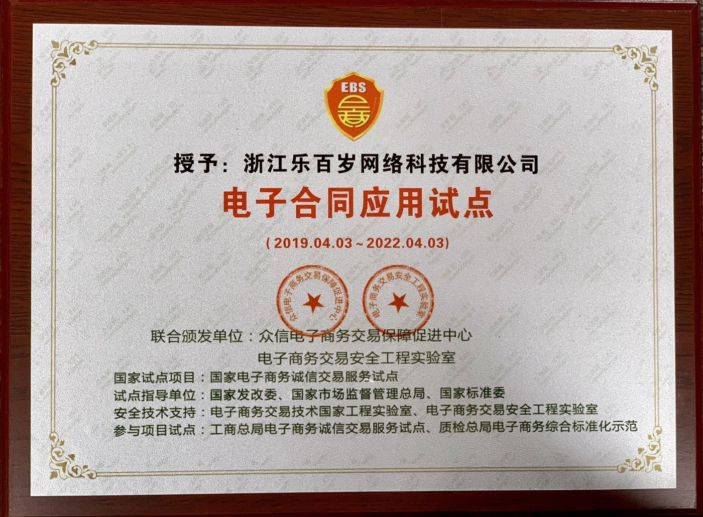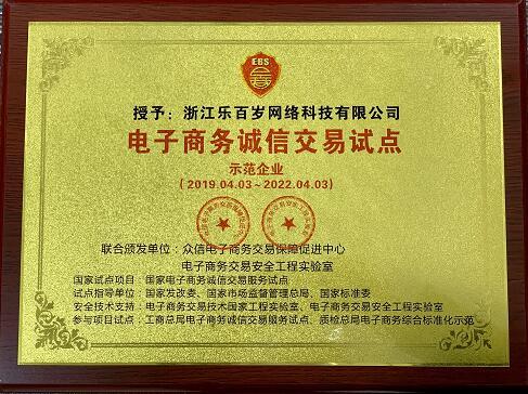 2019年4月,浙江樂百歲在經(jīng)過國家市場監(jiān)督管理總局,國家標準化管理委員會,國家發(fā)展和改革委員會等九大國家數(shù)據(jù)庫的嚴格交互審核,成為國家發(fā)改委“電子商務誠信交易服務試點”、國家標準委“電子商務綜合標準化示范”、國家市場監(jiān)管總局“電子合同標準研制與應用試點”。
